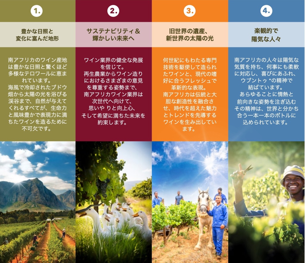 南アフリカワインが発信するメッセージ = 楽観的、たくましさ、多様性、温暖な気候と人のぬくもり。